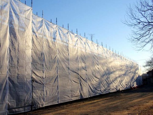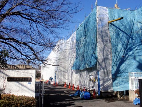 寮に帰ると建物全体が白いクロスでスッポリと覆われていた。お見事、さすがプロである。私はすぐに、吉村昭氏の小説『戦艦武蔵』を思い出した。寮の足場は270㍍もある戦艦武蔵とは比べものならないが、機密保持のため誰にもその姿を見せずに建造したという小説の内容だ。